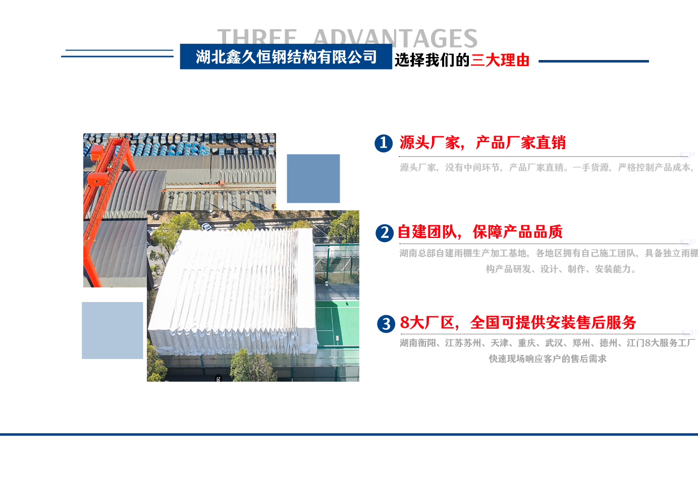 湖北鑫久恒鋼結(jié)構(gòu)有限公司是一家電動雨棚、膜結(jié)構(gòu)車棚研發(fā),生產(chǎn)銷售,施工安裝于一體的專業(yè)鋼結(jié)構(gòu)科技公司,主要產(chǎn)品有伸縮雨棚,電動雨棚,膜結(jié)構(gòu)車棚等。 湖南地區(qū)職員目前有80多人,占地面積20000平方米,廠房面積15600平方米,配備先進(jìn)的生產(chǎn)流水線,使每件品質(zhì)產(chǎn)品的堅實基礎(chǔ)。 公司在蘇州、天津、重慶、武漢、德州、烏魯木齊、江門均設(shè)有服務(wù)工廠,總?cè)藛T共300多人,擁有專業(yè)的技術(shù)團(tuán)隊,配備先進(jìn)的設(shè)備和流水線生產(chǎn),產(chǎn)能高,貨源充足,發(fā)貨速度快,服務(wù)區(qū)域廣。 移動伸縮棚適用于通道臨時倉儲、戶外運動遮陽、污水池遮蓋、能源交通、熱力化工、礦山、船舶制造及市政建設(shè)、物流、碼頭等領(lǐng)域的構(gòu)件制作加工,成品半成品存放、倉庫、野外儀器設(shè)備操作用房等。尤其是對工廠發(fā)貨、倉儲臨時遮雨防嗮,梅雨期較長、建設(shè)周期較短的工程施工等特別適用。還可根據(jù)用戶需求量身定制、適合企業(yè)所需不同款式的產(chǎn)品。 我公司堅持“誠信社會為本,客戶滿意為榮”的經(jīng)營理念,做到質(zhì)量把控,嚴(yán)格管理,精益求精,恪守承諾。使鑫久恒逐步走向成熟,其系統(tǒng)化、專業(yè)化日趨完善。以專業(yè)的技術(shù)、科學(xué)的管理,更高的產(chǎn)品質(zhì)量,優(yōu)良的企業(yè)信譽,真誠的客戶服務(wù),靈活多樣的經(jīng)營方式和務(wù)實創(chuàng)新的企業(yè)精神愿與社會各界攜手合作,為推動智能鋼結(jié)構(gòu)建筑事業(yè)的發(fā)展而不斷努力。...